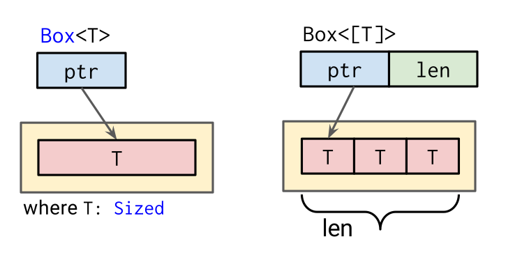 - Reference-а в този случай е "fat pointer", който държи не само указател, но и размера на парчето данни, което има този тип.