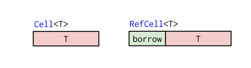 use std::cell::RefCell; fn main() { let cell = RefCell::new(String::from("foo")); // няма `mut` println!("{}", cell.borrow()); // -> Ref{ let mut r = cell.borrow_mut(); // -> RefMut r.push_str("bar"); } println!("{}", cell.borrow()); // -> Ref }