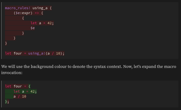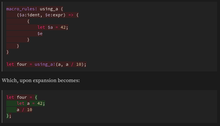 всъщност не е макро, а е "syntax extension", имплементирано на ниво компилатор- Името на макроса следвано от чифт скоби за тялото на макроса: